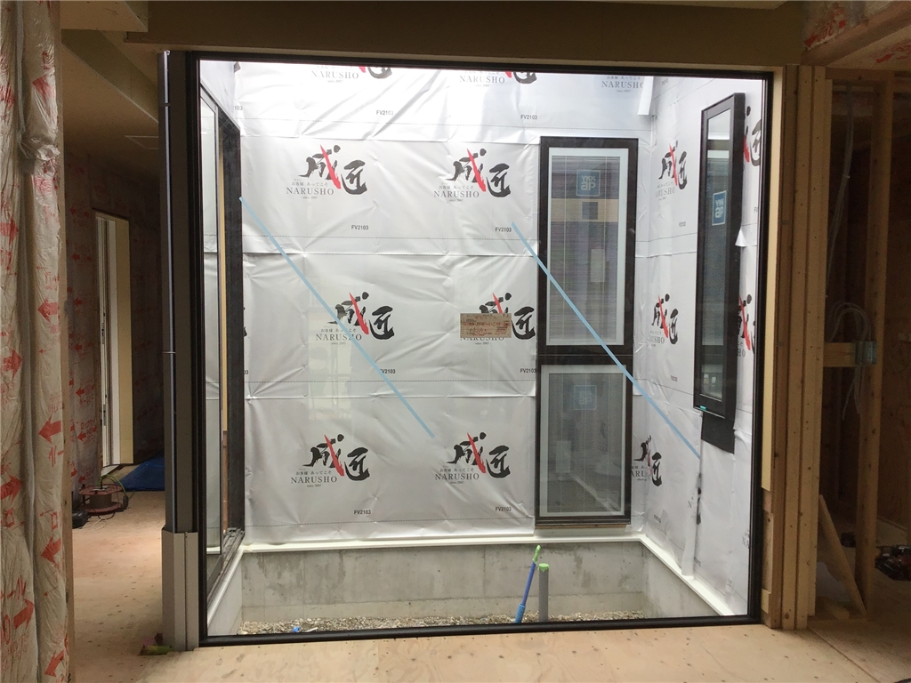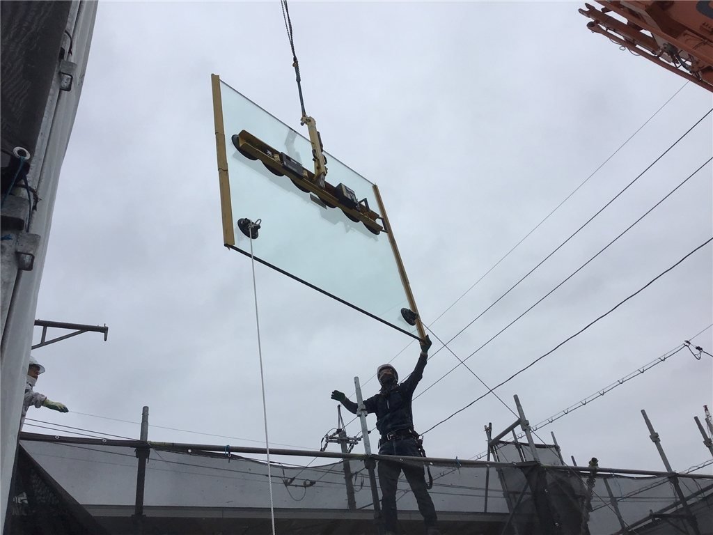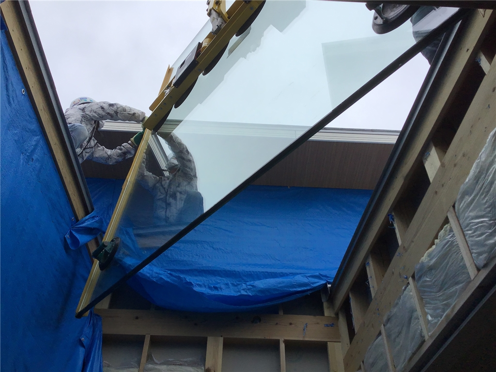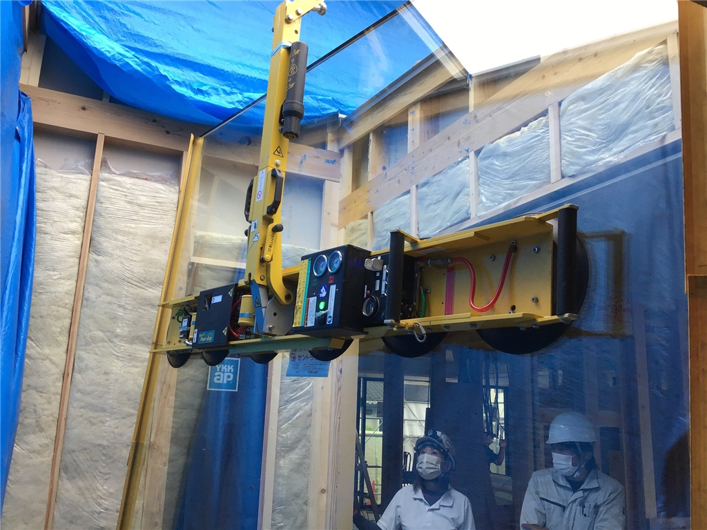モデル住宅も順調に工事が進んでいます、今日は一般的な住宅では使わないようなガラスの搬入をしました