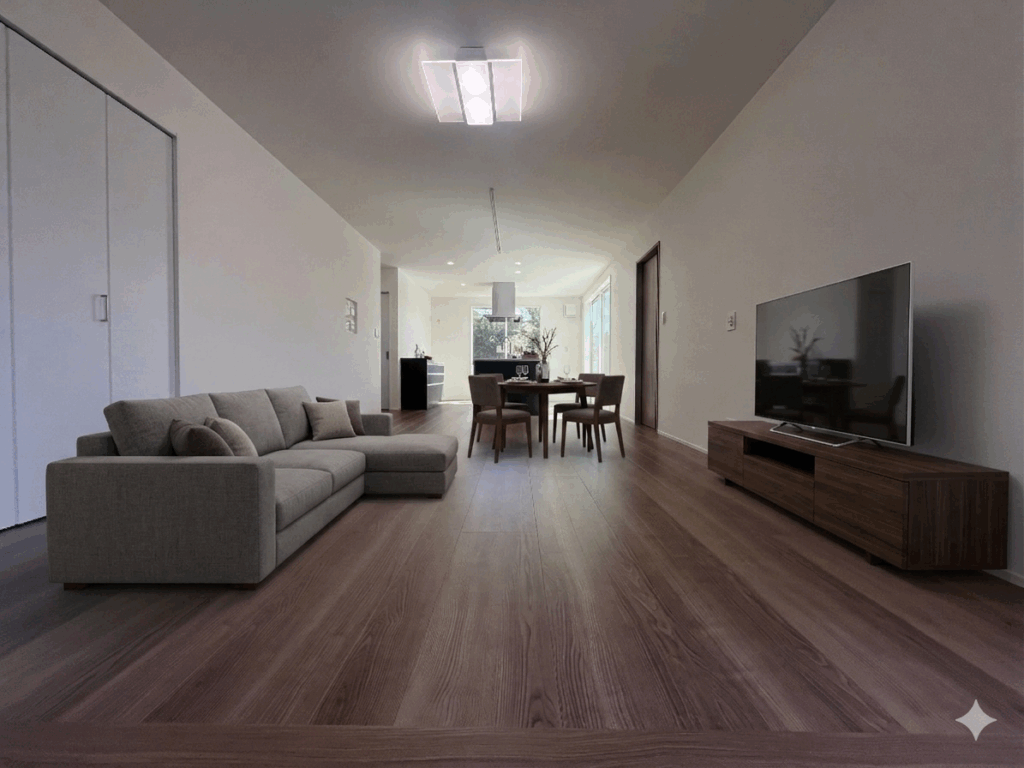 玄関ドアを開くと開放的なオープンリビングが広がり、視線がリビングの奥まで抜けるため実際の坪数以上の広さを感じます。(オープンリビングとはここでは玄関からリビングの間に仕切りがない空間のことをいいます。)家族の帰宅がすぐにわかる安心の間取り。自然と家族間のコミュニケーションも増えそうです。お子様が小さい間は「ただいま」の声がすぐに聞こえるのがうれしいですね♪