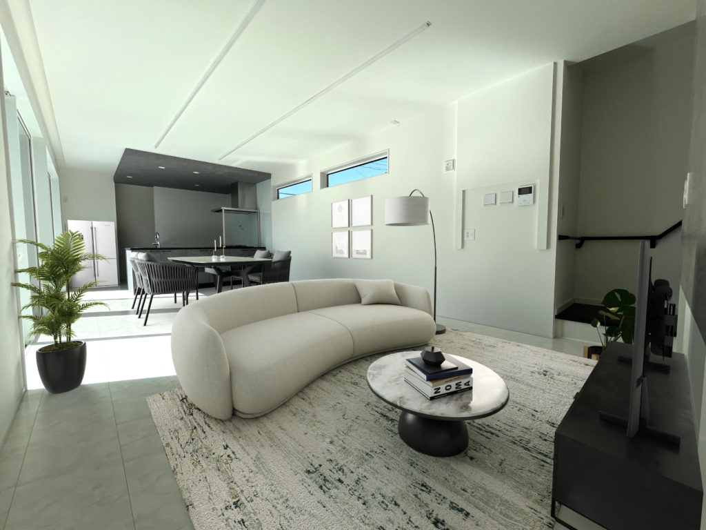 こちらは長く伸びた土地にプランされたお宅。1階には寝室と3.5畳の趣味部屋。また水廻りは「ただいま洗面台」をはじめ4.5畳の広々としたファミリークローゼットにそのまま隣に広めの脱衣室が作られました。玄関からそのまま着替えまでが終わる帰宅動線も考えられています。またリビングは土地に沿わせて縦に伸びた21畳のゆったりとした集いの空間。2階には個室が4部屋とプライベート空間も充実したお家です。ホワイトとブラックのコントラストにコンクリートグレーという石目調を多用しモダンでホテルライクな印象のクールなお家に仕上がっています。
